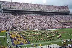 One of the most celebrated traditions carried on by the band is its pregame performance at each home football game. The performance includes pieces from the band's expansive repertoire of school songs, including "Pregame Salute"/"Touchdown for LSU" arranged in 1964 by director William F. Swor specifically for the band to play during pregame.[15] The drill design and musical selections pieced together by Swor remain relatively unchanged today. The band also uses a more traditional style of marching (called the "peak step" by directors and members of the band) during pregame, a style that requires the band members to lift their legs to mid-calf as they march.