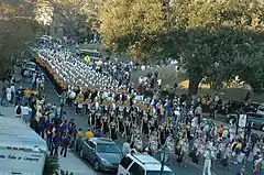 On game days, the band marches from the band hall to Tiger Stadium, stopping along the way at Victory Hill, located right outside the stadium. "Thousands of fans lining North Stadium Drive listen for the cadence of drums announcing the band's departure from the Greek Theatre" and await the impending arrival of the band.[14] The band stops on the hill and begins to play the opening strains of the "Pregame Salute." Then, while playing the introduction to "Touchdown for LSU," the band begins to run in tempo through the streets and down the hill amidst the crowd of cheering fans. The band also marches from the stadium to the band hall upon the conclusion of the game, a practice not usually employed by other bands.[9]