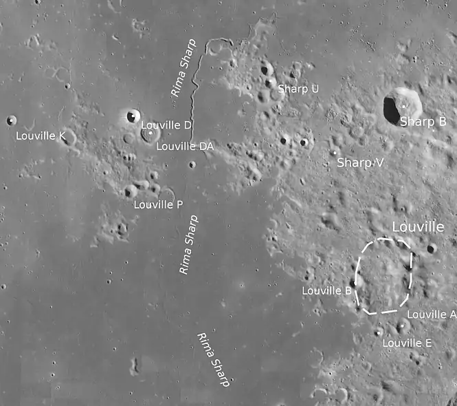 To the west across the lunar mare is a long, slender rille designated Rima Sharp. This follows a generally north–south route, beginning to the north-northwest of Louville and continuing until it terminates to the south-southwest. The total diameter of this formation is 107 km.
