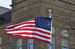 The courthouse was built of rusticated sandstone in the Richardsonian Romanesque style.[6] It was designed by the Des Moines architectural firm of Foster & Liebbe, and built by G.J. Stewart & Company of Chariton. The building features both round and segmental arches, turrets with conical roofs, and finials. The windows are vertical and narrow. The tower was originally topped by a spire, with minor caps that flanked it.[3] The building is similar in style to the Wapello County Courthouse in Ottumwa, which was also designed by Foster & Liebbe and completed the year before.[2] The square the courthouse sits on was included as a contributing site in the Lucas County Courthouse Square Historic District. Besides the courthouse, the square is also the location for the Civil War Memorial (1916-contributing object), the Mormon Trail Marker (1923-contributing object), a bandstand (c. 2000), and Veteran's Memorial (c. 2000). The significance of the courthouse is derived from its association with county government, and the political power and prestige of Chariton as the county seat.[6]