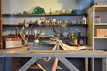 Rie's small studio was at 18 Albion Mews, a narrow street of converted stables near Hyde Park in London. She invited many people to her studio and was renowned for giving her visitors tea and cake. The studio remained almost unchanged during the 50 years she occupied it and has been reconstructed in the Victoria and Albert Museum's ceramics gallery.