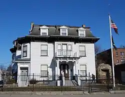 The three-story, wood-framed house was built around 1870 for industrialist Lucius Knowles, best known for his innovations in the manufacture of looms. It has a symmetrical front facade with mansard roof, and a front entry sheltered by an elaborately decorated porch. Another entry on the south side also had a decorated porch, now glassed in, above which there is an oriel window. A unique music room was added to the northeast corner of the house around 1880, to a design by Stephen Earle, which featured stained glass skylights (now covered over but still in place).[2]