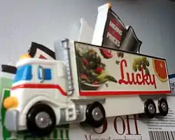 During the 1980s and 1990s, TV personality Stephanie Edwards was a spokeswoman appearing in television commercials for Lucky stores. The marketing department was known as LuGem Advertising until 1986, located within the distribution center in Buena Park, CA.[9]