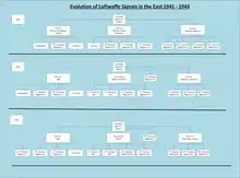 With the expansion of the war into fronts, the importance of Luftwaffe signals in the west increased. Luftflotte 3 became increasingly dependent on the intelligence reports from the Referat. The radar organisation that by 1942 had pass the experimental stage and was now active units. In the same year the unit Signals Regiment West that was assigned to Luftflotte 3 and organised into three battalions.[22]