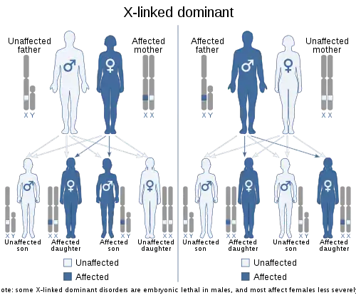 Lujan–Fryns syndrome is inherited in an X-linked dominant manner.[9][13][37] This means the defective gene responsible for the disorder (MED12) is located on the X chromosome, and only one copy of the defective gene is sufficient to cause the disorder when inherited from a parent who has the disorder. Males are normally hemizygous for the X chromosome, having only one copy. As a result, X-linked dominant disorders usually show higher expressivity in males than females. This phenomenon is thought to occur with LFS.[13][37]