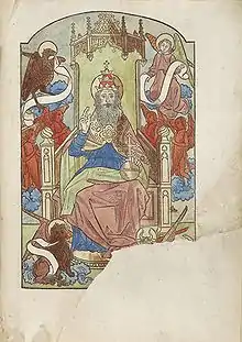 This missal contains the liturgy for the Mass according to the Sarum Rite (or Sarum Use) and is known as a Sarum Missal. This was the most popular version of the Mass used in England before the Reformation. This copy of the missal is from the earliest known printed edition of a Sarum Missal. It is printed throughout in two colours, red and black, and is the first book to carry Caxton's printer's device.[1] The missal is printed in ink on paper, with a leather binding, and it measures 34 by 24 cm.[2] It was famous at the time it was printed because it was one of the first books printed in two colours.[3] The missal contains 243 of its original 266 leaves and includes two full-page woodcuts coloured by hand; one depicts the Crucifixion of Jesus and the other God the Father enthroned. It was re-bound in the 19th century, but some fragments of the original 15th century binding survive.[4] Later markings have been added to the book by hand. These include a translation of the marriage service in English alongside the original Latin version,[1] obituaries relating to the deaths of members of the Legh family, and prayers to St Thomas.[4] In places the missal has been "censored" by hand, including the crossing out of the name of St Thomas Becket and of prayers for the Pope.[1]