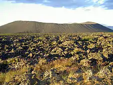 Postglacial volcanism in the Mývatn district may be divided into three cycles. The Lúdent cycle commenced shortly after the close of the Ice Age. The explosion crater (tephra ring) Lúdent dates from this cycle. Its eruption was followed by a number of small fissure eruptions. About 3800 years ago the shield volcano Ketildyngja was formed about 25 km south-east of Mývatn, and from it a huge lava flow, the Older Laxá-lava, spread over the southern part of the district, plunged down the Laxárdalur valley and flowed almost to the sea. This lava dammed up the first Mývatn, which was about as large as the present lake.