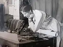 She was educated at Wimbledon High School, Chelsea School of Art, and the LCC Central School of Arts and Crafts, where she specialised in stained glass under Karl Parsons and Alfred Drury. From about 1911 she worked at The Glass House (Fulham) with her cousin, Margaret Agnes Rope, for example on the set of windows for SS Peter and Paul, Newport, Shropshire.[1] To distinguish herself from her namesake cousin, she used the professional name of M. E. Aldrich Rope (incorporating her mother's maiden name) or M. E. A. Rope. One of her friends was J. Harold Gibbons (church architect) and this connection led to her first major commission for St Chad's Church, Far Headingley, Leeds, which is among her greatest works.[2][3]