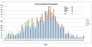 A Graphical Representation of M.S.Viswanathan's Discography Over the Years with Colors to Represent Different Languages.