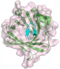 Figure 3: Crystal structure of C8γ (green) with peptide from C8α (cyan).[27] .