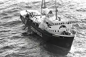 During her 15 years of service with Greenpeace, the MV or Black Pig as she was known by her crew,[1] circumnavigated the globe several times, participating in numerous campaigns. Her first deployment was as part of the "World Park Antarctica" campaign but following the sinking of the Warrior, she was diverted en route from Europe to New Zealand via the Panama canal, to first participate as part of a peace convoy protesting against French Nuclear Testing at Moruroa Atoll, before continuing to carry on with the Antarctica campaign as planned. The next decade and a half saw her involved in Greenpeace campaigns around the world, from the Persian Gulf to the Antarctic.