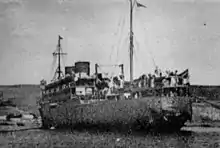 While sailing as a troopship, the Llangibby Castle was torpedoed on 16 January 1942 by the German submarine U-402, under the command of Siegfried von Forstner, during U-402's second patrol in the Bay of Biscay. The torpedo hit the Llangibby Castle's stern, killing 26 people and blowing away her after gun and the rudder.[5] Her engines were still operational and she was able to limp to Horta, in the Azores, steering with her engines, and only making 9 knots (17 km/h).[5][6] During the voyage she had to fight off attacks from German Focke-Wulf Fw 200 "Condor" long range patrol bombers. She arrived safely at Horta on 19 January, but could only stop for 14 days as Portugal was a neutral country. After making some repairs she prepared to sail again for Gibraltar on 2 February, escorted by the destroyers HMS Croome, HMS Westcott and HMS Exmoor, and towed by the tugboat Thames.[5] The convoy was followed by several U-boats, but escaped damage, with Westcott sinking U-581.[5] The small convoy arrived at Gibraltar on 8 February, where the troops were disembarked, and some temporary repairs carried out.[7] Llangibby Castle sailed for Britain on 6 April, still lacking a rudder. She arrived in Britain on 13 April, having sailed 3400 miles with a damaged stern and steering by engines, an achievement which led to her master, a man named Bayer, being awarded the OBE.[4]