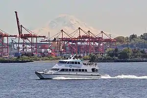![]() The Rachel Marie in Eliott Bay on the Downtown Seattle-West Seattle route with Mount Rainier in the background in May 2013. | |
