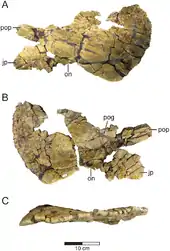It contains a single species, M. cronusi, first described and named in 2016 by Eric K. Lund, Patrick M. O’Connor, Mark A. Loewen and Zubair A. Jinnah. The generic name is derived from Greek machairis, meaning "bent sword", in reference to its unique frill ornamentation showing two forward curving horns on the frill's uppermost part, and Latinized Greek ceratops, meaning "horned-face", which is a common suffix for ceratopsian genera names. The specific name cronusi refers to Cronus, a Greek god who deposed his father Uranus by castrating him with a sickle or scythe based on the mythology, and as such is shown carrying a curved bladed weapon. Machairoceratops is known solely from the holotype UMNH VP 20550, found in 2006, which is housed at the Natural History Museum of Utah. It is represented by a partial skull including two curved and elongate eyesocket horncores, the left jugal bone, a nearly complete but slightly deformed braincase, the left squamosal bone, and a parietal bone complex and its unique horn ornamentation, all collected in association.[1]
