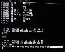 It was not unheard of to perform all of one's programming in a monitor in lieu of a full-fledged symbolic assembler. Even after full-featured assemblers became readily available, a machine code monitor was indispensable for debugging programs. The usual technique was to set break points in the code undergoing testing (e.g., with a BRK instruction in 6502 assembly language[1][2][3]) and start the program. When the microprocessor encountered a break point, the test program would be interrupted and control would be transferred to the machine code monitor. Typically, this would trigger a register dump and then the monitor would await programmer input. Activities at this point might include examining memory contents, patching code and/or perhaps altering the processor registers prior to restarting the test program.