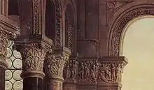 There appears to be a series of illustrations of the Seven deadly sins distributed among the details of the painting. The reliefs just over Rolin's head show (from left) the expulsion of Adam and Eve from Paradise (Pride), the Killing of Abel by Cain (Envy) and the Drunkenness of Noah (Gluttony). Then the lion-heads on the capitals behind Rolin may stand for Anger, and the tiny squashed rabbits between column and base in the loggia screen for Lust (which they were considered to exemplify in the Middle Ages). All these details are on Rolin's side of the painting; no equivalents are visible on the other, divine, side. However this leaves Avarice and Sloth unaccounted for, unless perhaps the human figures of Rolin himself (with his underdrawn purse), and the idlers out on the terrace (perhaps including, as stated above, van Eyck himself) represent the last two vices.[8]