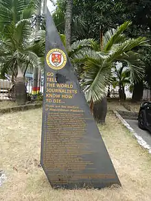 According to the authorities, the attack killed 58 people, including 32 journalists.[7][26][27][28] However, the body of 58th victim was never found.[29] Reporters Without Borders announced that at least 12 of the victims were journalists, making this the deadliest such incident in the history of news media.[30] The National Union of Journalists in the Philippines originally estimated that a total of 20 journalists were killed, including an undisclosed number of NUJP members.[27] The Philippine Daily Inquirer later updated the number of journalists killed to 34.[14]