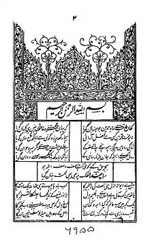 Mah Laqa was influenced by the literary work of mystic poet Siraj Aurangabadi (1715–1763),[2]:121[17]:4109 and learned poetry from Nawab Mir Alam who later became the Prime Minister of Hyderabad State. Her first language was Urdu, and she was also fluent in Arabic, Persian and Bhojpuri languages.[4]:118 & 123 She was the first woman poet to author a diwan, a complete collection of Urdu ghazals. The collection, named Gulzar-e-Mahlaqa, comprises 39 ghazals, and each ghazal consists of 5 couplets. The collection was published in 1824 after her death.[2]:121–2[18] The Diwan e Chanda is a manuscript collection of Mah Laqa's 125 Ghazals, compiled and calligraphed by her in 1798. It was signed and gifted to Captain Malcolm on 18 October 1799, during a dance performance at Mir Alam's residence. It is now preserved in the British Museum.[19][20]:521–2