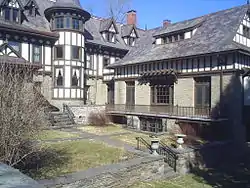 Major's Inn and Gilbert Block is a historic inn and tavern and commercial building at Gilbertsville in Otsego County, New York. The Gilbert Block consists of three 2-story attached brick commercial structures varying slightly in height in the Neo-Tudor Style. It was built between 1893 and 1895, and hosts shops and artist's studios. It was designed by Boston architect Henry Forbes Bigelow. Major's Inn was started in 1896 and finished in 1917 on the site of the original 1822 Gilbert homestead which burned in 1895. It is a 3 1⁄2-story structure with a gable roof covered in slate, interrupted by a number of chimneys, dormers, and conical roofs on towers. It has a rambling effect accented by the use of a variety of projecting balconies and bays, towers, and several porches. The medieval English Tudor and Gothic building was commissioned by Major James L. Gilbert using Augustus Nicholas Allen to construct it. Decorative elements on both buildings incorporate the quatrefoil.[2] The Inn went through a series of owners during the 1950s to 1970s and, beginning in 1980, a group founded by Alan Cleinman which became the Major's Inn Foundation, Inc. began to raise funds for the purchase of the property. Today, under the ownership of the Foundation, the Major's Inn has been significantly restored and serves as a cultural center.