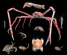 The class Malacostraca includes about 40,000 species,[5] and "arguably ... contains a greater diversity of body forms than any other class in the animal kingdom".[6] Its members are characterised by the presence of three tagmata (specialized groupings of multiple segments) – a five-segmented head, an eight-segmented thorax and an abdomen with six segments and a telson, except in the Leptostraca, which retain the ancestral condition of seven abdominal segments.[6] Malacostracans have abdominal appendages, a fact that differentiates them from all other major crustacean taxa except Remipedia.[7] Each body segment bears a pair of jointed appendages, although these may be lost secondarily.[8]