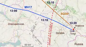 Malaysia Airlines Flight 17 (MH17)[lower-alpha 1] was a scheduled passenger flight from Amsterdam to Kuala Lumpur that was shot down on 17 July 2014 while flying over eastern Ukraine. All 283 passengers and 15 crew were killed.[3] Contact with the aircraft, a Boeing 777-200ER, was lost when it was about 50 km (31 mi) from the Ukraine–Russia border, and wreckage of the aircraft fell near Hrabove in Donetsk Oblast, Ukraine, 40 km (25 mi) from the border.[4] It was Malaysia Airlines' second aircraft loss during 2014, after the disappearance of Flight 370 on 8 March.[5] The shoot-down occurred in the War in Donbass, during the Battle in Shakhtarsk Raion, in an area controlled by pro-Russian rebels.[6] The Ukrainian Air Force had suffered losses from increasingly sophisticated air defence weaponry. Immediately after contact with the aircraft was lost, the rebel militia in Donetsk claimed to have shot down a Ukrainian An-26 military transport airplane.[7] When it became apparent that the wreckage that fell near Hrabove was from a civilian airliner, the separatists withdrew this claim and denied shooting down any aircraft.[8][9][10]
