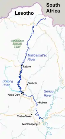 The Malibamat'so forms the northern arm of the Katse Dam reservoir, a part of the Lesotho Highlands Water Project. Katse is Africa's highest elevation dam at 1,993 metres (6,539 ft) above sea level.[1] Here the river is joined by the Bokong/Bokung River. Downstream the Malibamat'so's left bank tributaries are the Matsoku and Semenanyane Rivers, before it forms a right bank tributary of the Senqu/Orange River.