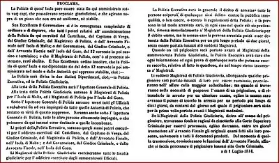 By Proclamation XXII of 1 July 1814, Maitland ordered and directed that all powers up to then exercised with respect to the administration of the police of the island of Malta and its dependencies were to be administered by the authorities under established procedures, after 12 July 1814.[6]