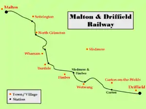 The Malton and Driffield Junction Railway, later known as the Malton and Driffield branch was a railway line in Yorkshire that ran between the towns of Malton, North Yorkshire and Driffield in the East Riding of Yorkshire.[2]