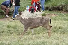 The mule deer (Odocoileus hemionus) is a deer whose habitat is in the western half of North America. It gets its name from its large mule-like ears. Adult male mule deer are called bucks, adult females are called does, and young of both sexes are called fawns. The black-tailed deer is considered by some a distinct species though it is classified as a subspecies of the mule deer. Unlike its cousin, the white-tailed deer, mule deer are generally more associated with the land west of the Missouri River. The most noticeable differences between whitetails and mule deer are the color of their tails and configuration of their antlers. The mule deer's tail is black tipped.