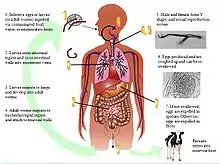Hypothesis #1: Infection initially begins by the ingestion of foods, water, or intermediate hosts contaminated by adult worms. The infective adults migrate to the larynx or trachea and attach to the mucosal walls. Sexual reproduction occurs here, and the females begin to lay eggs in the upper respiratory region. Eggs do not develop at body temperature, and are expelled in sputum or reswallowed and excreted in feces.[5]