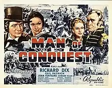 Man of Conquest is a 1939 American Western film directed by George Nicholls Jr. and starring Richard Dix, Gail Patrick, and Joan Fontaine. The film was nominated for three Academy Awards for Best Score, Best Sound (Charles L. Lootens), and Best Art Direction (John Victor Mackay).[1]