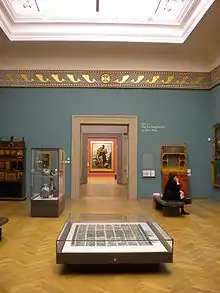 The gallery has fine art collection consisting of more than 2,000 oil paintings, 3,000 watercolours and drawings, 250 sculptures, 90 miniatures and around 1,000 prints.[12] It owns more than 13,000 decorative art objects including ceramics, glass, enamels, furniture, metalwork, arms and armour, wallpapers, dolls houses and related items.[13] The oldest object is an Egyptian canopic jar from circa 1100 BC.[13]