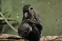 Mandrills seem to live in very large, stable groups named 'hordes'. A horde can number in the hundreds of mandrills, possibly averaging around 615 individuals and reaching as many as 845.[23][25][26] It is difficult to accurately estimate horde size in the forest, but filming a horde crossing a gap between two forest patches or crossing a road is a reliable way of estimating the total number. The largest horde verifiably observed in this way contained over 1,300 individuals, in Lopé National Park, Gabon—the largest aggregation of nonhuman primates ever recorded.[36] In the wild, males disperse and only female mandrills remain in their birth group. This benefits females to establish strong relationships with their relatives which can provide support during conflicts, better offspring and longer lifespan.[37][38] These hordes are made of adult females and their dependent offspring.[39] Males live a solitary lifestyle, and enter hordes only when females are receptive to mating, which lasts three months each year.[25][39] All-male bachelor groups are not known to exist.[25][39] The mating season of the mandrill takes place from June to October, which is when the sexual swellings of the female occur.[39] They breed every two years. When breeding, a male will follow and guard a female in estrus. Adult males exist in two different forms: the brightly colored and "fatted" dominant males, and the paler and "nonfatted" subordinate males. Both males engage in mating, but only the dominant males can sire offspring. Males sometimes fight for breeding rights which results in dominance. Though conflicts are rare, they can be deadly. Gaining dominance, that is becoming the alpha male, results in an "increased testicular volume, reddening of sexual skin on the face and genitalia, and heightened secretion of the sternal cutaneous gland".[9] When a male loses dominance or its alpha status, the reverse happens, although the blue ridges remain brightened. There is also a fall in its reproductive success. This effect is gradual and takes place over a few years.[40][41][42] When subordinates mate-guard a female, the competition between them allows the dominant males to have a greater chance of siring offspring,[43] since subordinates outnumber dominants 21 to 1. There is also a dominance hierarchy among females, with reproductive success being displayed in shorter interbirth intervals amongst these alpha figures and the beginning of reproduction at earlier ages.[43]