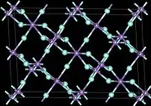 Like vanadium(III) fluoride, MnF3 features octahedral metal centers with the same average M-F bond distances. In the Mn compound, however, is distorted (and hence a monoclinic unit cell vs. a higher symmetry one) due to the Jahn-Teller effect, with pairs of Mn-F distances of 1.79, 1.91, 2.09 Å.[4][5][6]