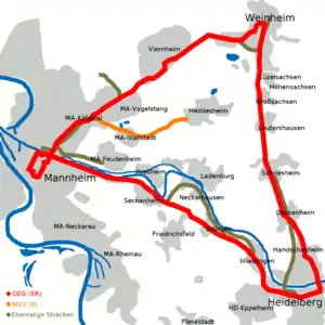 The Mannheim–Weinheim railway is a metre-gauge railway between Mannheim-Neckarstadt-Ost/Wohlgelegen and Weinheim, mainly in the German state of Baden-Württemberg. It was built by the former Oberrheinischen Eisenbahn-Gesellschaft AG (Upper Rhine Railway Company, OEG), later MVV OEG AG and is now operated by MVV Verkehr GmbH (infrastructure owner) and RNV (operations manager and train operator) according to Eisenbahn-Bau- und Betriebsordnung für Schmalspurbahnen (narrow-gauge railway regulations; ESBO). However, the line is still owned by MVV Verkehr AG (the City of Mannheim's transport utility) as the successor to the OEG. It is operated as a branch line using electronic direct traffic control.