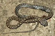 Dorsally, it is grayish with oblique black crossbars, and has a series of whitish spots along the vertebral line. On the head, it has a pair of black streaks from the prefrontals to the occiput, another black streak from the eye to the commissure of the jaws, and another along the nape. The upper labials are black-edged. Ventrally, it is spotted or checkered with dark brown or black. Adults are about 875 mm (34.5 in) in total length.[2]