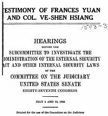 - CONGRESSIONAL HEARING HRG-1952-SJS-0024, Subcommittee To Investigate the Administration of the Internal Security Act and Other Internal Security Laws; Committee on the Judiciary, "Testimony of Frances Yuan and Col. Ve-Shen Hsiang", Hearing Dates: 1, 10 Jul. 1952; Senate Sudoc Number: Y4.J89/2:Y9/3; Length: 61 pp.; Legacy CIS Number: 87 S1543-3.