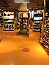 After many delays including finding a creek running through the basement and a time capsule behind the 1931 cornerstone on Carlton Street, the new store opened on November 30, 2011. It incorporated many elements of Maple Leaf Gardens including original seats, a red dot on the ground floor marking the original centre ice location, the recreation of an original mural by the checkouts and a giant maple leaf made out of old seats from the arena among numerous other things. The centre also includes underground parking, a Joe Fresh, an LCBO liquor store and a medical clinic. It is the chain's flagship location.[52] The transformation would win a World Architecture News Retail and Leisure Interiors Award in the "Retail outlets over 200 square metres (2,200 sq ft)" category.[53]