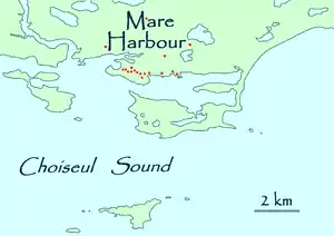 Mare Harbour is a small settlement on East Falkland, on Choiseul Sound. It is mostly used as a port facility and depot for RAF Mount Pleasant,[1] as well as a deepwater port used by the Royal Navy ships patrolling the South Atlantic and Antarctica, which means that the main harbour of the islands, Stanley Harbour tends to deal with commercial transport.