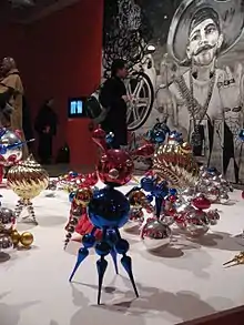Marepe renders objects which may seem useless but which are a necessity in some of the under developed areas of Brazil. In contrast with this, he calls his works "necessities".[18] One of Marepe's artworks, Peixe Com Auréola (2012), consisted in a bicycle designed in such way it couldn't be ridden, having a wheel emerging from the seat. He also replaced the two classical wheels with a fish head in the front and a fish tail, both made of wood, in the back.[note 2] Through this artwork, according to the former American news website, Examiner.com, Marepe tried to express "the dire need in his community for the type of abundance necessary to pursue greater meaning in life".[20]