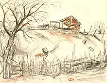 Lefranc arrived in Santa Fe in her old 1935 Dodge to disruptive events. Plans had changed due to Marriott's explosive temper directed toward the owner of two casitas. Lefranc and Marriott were suddenly homeless as it was the end of World War II, and the Los Alamos National Laboratory had swallowed all rental property in and around the area. They did find an empty house in Nambe consisting of three small rooms in a row, each with a door to the outside. It looked exactly like a railroad car with a discreet privy fifty feet away. It had no heating, no water, no electricity and no furniture either. It was a life experience which Lefranc illustrated for Marriott in The Valley Below[26] and a story detailed for Lois Katz, author,[27] and for Sandra D'Emilio.[28]
