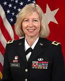 Margaret W. Burcham attended the United States Military Academy at West Point and was commissioned from there into the United States Army Corps of Engineers (USACE) in 1982.[1] She holds a masters degree in computer science from Kansas State University and is married to Jay Burcham.[1][2] Burcham attended the Engineer Officer Basic and Advanced Courses and also studied at the Combined Arms Services Staff School, the United States Army Command and General Staff College, the Senior Service College and the Industrial College of the Armed Forces.[1] Burcham has been chief of the Joint Capabilities Division of the Resources, Assessments and Force Management Directorate at the Pentagon and commander of the USACE North Engineer District in Iraq and the Europe Engineer District. She was appointed commander of the USACE Great Lakes and Ohio River Division in September 2011, the first woman to command a USACE division.[3] In this role, Burcham commanded 4,800 personnel in seven engineering districts covering 17 states and including the waters within the Great Lakes and Ohio River basins.[1] Her annual budget was $2 billion and the division's responsibilities included the maintenance of navigational aids, flood defense projects, water conservation schemes, hydro-electric power and environmental restoration projects of an asset value of over $80 billion.[4] She was promoted to brigadier general on January 27, 2012 at the USACE headquarters in Washington and became the first female general of the USACE.[1] She was appointed to the Mississippi River Commission on May 28, 2013 by President Barack Obama.[5]