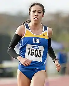 ![]() Maria Bernard running for the UBC Thunderbirds at the UBC Invitational track and field meet on April 3, 2015. | |