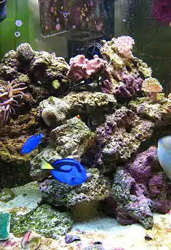 Almost all species kept in marine aquaria at this time are caught in the wild, although tank-raised specimens are becoming increasingly common as a viable alternative. The list of marine aquarium fish, such as clownfish that are captive-bred and available on a commercial scale, is increasing. As of a 2019 report, there were nearly 400 known captive-bred species, 46 that were considered commonly available.[27] Much collecting is done in Indonesia and the Philippines, where use of cyanide and other destructive collection methods, while discouraged, is unfortunately common. The majority of live rock is also harvested in the wild, and recent restrictions on this harvest in Florida have caused a shift to Fijian and aquacultured rock. Natural rock, because it is created by coral polyps, takes many years if not centuries to form, and is a vital habitat for countless marine species; thus, commercial-scale harvesting of naturally occurring live rock has been criticized by conservationists. Additionally, many animal species sold to hobbyists have very specific dietary and habitat requirements that cannot be met by hobbyists (e.g. genus Labroides wrasses, the moorish idol); these animals almost inevitably die quickly and have markedly reduced lifespans compared to wild specimens. Often these specific environmental requirements cause improperly housed livestock's color and appearance to be poor. These issues are often downplayed by individuals and organizations with a financial interest in the trade. Hobbyists who support conservation should buy only certified net-caught fish (although ensuring the legitimacy of such claims can be difficult) or captive-raised fish, as well as farmed corals and to support legitimate reef conservation efforts. The majority of corals can be "fragged", whereby a portion of a larger captive coral is separated and can subsequently be raised into an individual specimen, allowing for coral propagation within the domestic aquarium; the trade in frags (i.e. fragments) offers a fantastic opportunity for marine aquarists to obtain new and unique corals while limiting the impact on the natural environment. Rare species and those without a history of being successfully kept in captivity should be avoided.