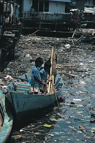 Marine pollution occurs when harmful effects result from the entry into the ocean of chemicals, particles, industrial, agricultural and residential waste, noise, or the spread of invasive organisms. Eighty percent of marine pollution comes from land. Air pollution is also a contributing factor by carrying off iron, carbonic acid, nitrogen, silicon, sulfur, pesticides or dust particles into the ocean.[44] Land and air pollution have proven to be harmful to marine life and its habitats.[45]