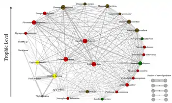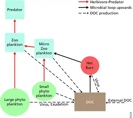 For pelagic ecosystems, Legendre and Rassoulzadagan proposed in 1995 a continuum of trophic pathways with the herbivorous food-chain and microbial loop as food-web end members.[47] The classical linear food-chain end-member involves grazing by zooplankton on larger phytoplankton and subsequent predation on zooplankton by either larger zooplankton or another predator. In such a linear food-chain a predator can either lead to high phytoplankton biomass (in a system with phytoplankton, herbivore and a predator) or reduced phytoplankton biomass (in a system with four levels). Changes in predator abundance can, thus, lead to trophic cascades.[48] The microbial loop end-member involves not only phytoplankton, as basal resource, but also dissolved organic carbon.[49] Dissolved organic carbon is used by heterotrophic bacteria for growth are predated upon by larger zooplankton. Consequently, dissolved organic carbon is transformed, via a bacterial-microzooplankton loop, to zooplankton. These two end-member carbon processing pathways are connected at multiple levels. Small phytoplankton can be consumed directly by microzooplankton.[46]