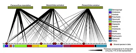 - Leray M, Meyer CP, Mills SC. (2015) "Metabarcoding dietary analysis of coral dwelling predatory fish demonstrates the minor contribution of coral mutualists to their highly partitioned, generalist diet". PeerJ, 3: e1047. doi:10.7717/peerj.1047.