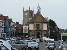 On 28 April 1653 the Great Fire of Marlborough started in a tanner's yard and spread quickly, eventually after four hours burning the Guildhall, St Mary's Church, the County Armoury, and 244 houses[11] to the ground.[12] This event attracted more than local attention; the parish register of Wotton under Edge, in the west of Gloucestershire, records on 9th August 1653 that 18 pounds 17 shillings and six and a half pence had been collected in the parish for the relief of the distressed inhabitants of Marlborough.[13] During the rebuilding of the town after the Great Fire, the high street was widened and is often claimed to be the widest in England though the actual widest is in Stockton-on-Tees. This wide street allows ample space for the local market. Fire swept through the town again in 1679 and 1690. This time, an Act of Parliament was passed "to prohibit the covering of houses and other buildings with thatch in the Town of Marlborough".[14]
