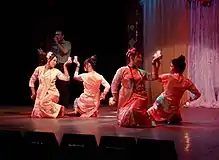 Marmas follow the Burmese calendar. They celebrate the New Year, called Sangrain (သင်္ကြန်), which begins on the first day of Bohag.[13] They make sangraimu, which is a form of traditional cakes. They take part in Sangrain Relong Pwe (သင်္ကြန်ရေလောင်းပွဲ; water pouring), where young Marma men and women spray each other with water. Sangrai is celebrated in three days, On the 1st day, called Painchwai or Akro, homes are decorated with flowers. On the 2nd day, Sangrai Akya, Marmas participate in traditional sports, dances, cultural activities and hold meetings regarding community issues. They also go to monasteries to participate in the Buddha statue's bathing (cleansing) ritual on this day. On the 3rd day, called Sangrai Atada, they cook a vegetable dish made out of more than 100 ingredients, called hangbong (ဟင်းပေါင်း; pachan in Bangla).[14]