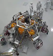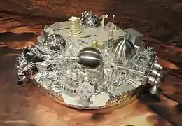 The Schiaparelli lander was intended to test technology for future soft landings on the surface of Mars as part of the ExoMars project. It was built in Italy by the European Space Agency (ESA) and Roscosmos. It was launched together with the ExoMars Trace Gas Orbiter (TGO) on 14 March 2016 and attempted a landing on 19 October 2016. Telemetry was lost about one minute before the scheduled landing time,[23] but confirmed that most elements of the landing plan, including heat shield operation, parachute deployment, and rocket activation, had been successful.[24] The Mars Reconnaissance Orbiter later captured imagery showing what appears to be Schiaparelli's crash site.[25]